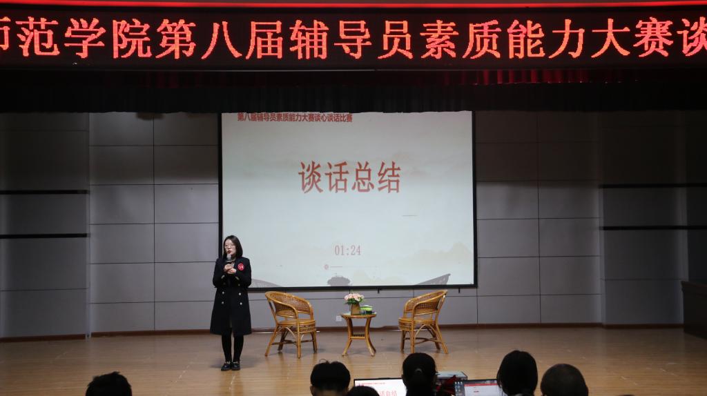 本比赛通过与学生谈心谈话、自我总结、回答“观察席”提问三个环节予以开展,主要考察辅导员对学生特征、学生成长成才规律的把握,以及对学生的教育引导与解决实际问题的能力。比赛现场模拟真实场景,参赛选手与学生开展谈心谈话。谈话围绕学生学业、职业发展、人际关系处理、思想教育和价值引领、学生党员发展、学生日常事务管理、心理健康教育等工作进行。通过选手的精彩展示和评委们的公正评判,共评出一等奖2名、二等奖3名、三等奖1名。