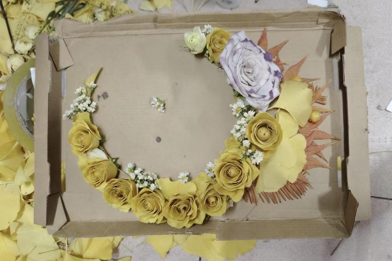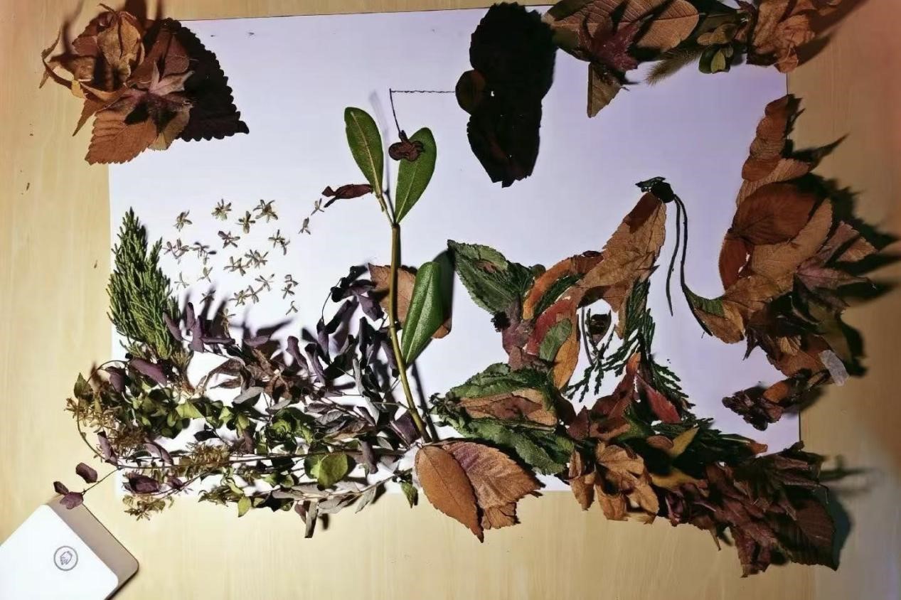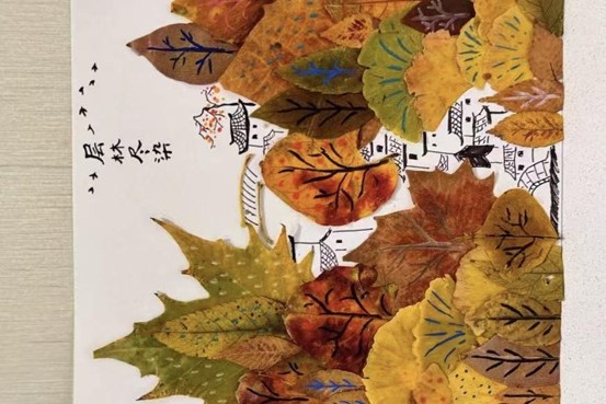 本次活动凭借“自然+创意”的双重吸引力,得到同学们的广泛关注。学生们通过在校园里捡拾落叶,通过修剪、拼贴、组合等方式,将普通的叶片转化为充满巧思的艺术作品——既有将枫叶与银杏拼贴成“秋日森林小鹿”的童趣创作,也有用银杏落叶和鲜花组成的一轮月亮,更有落叶加手绘完成的一副层林尽染图,每一件作品都承载着参与者对秋天的独特理解与情感。